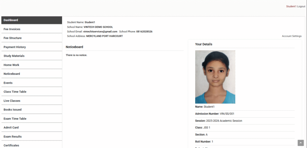 Student Dasboard where student accesses all academics records such as: